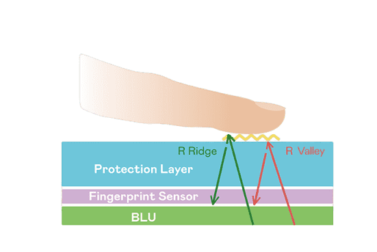 TFT 指纹扫描感测技术利用薄膜电晶体 (TFT) 当作光感测元件,,,,藉由非晶硅 (a-Si) 与低温多晶硅(LTPS)既有光电转换特性对不同波段光源进行吸收,,使感测 IC 读取阵列感测元件的光漏电差异,,,,转换成数位灰阶影像。。